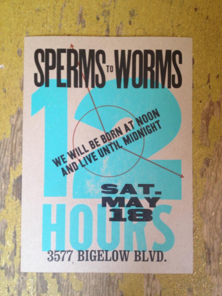 Sperms to Worms was an ambitious community art project that a loose group of Pittsburgh-based artists created together in the spring of 2013. The event lasted from noon to midnight, and each hour was designed by a new artist or team of artists to represent a different point in the human life. Noon to one was birth, one o clock was 0-3, two o clock was 4-5, and so on all the way to turning 75 at 11 pm and dying at midnight.